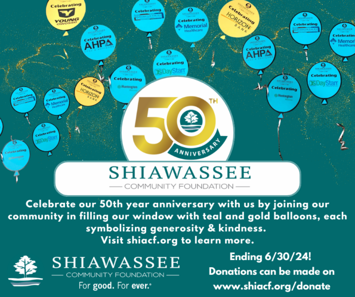 Hello! We’re thrilled to extend a heartfelt invitation to join us in commemorating the 50th anniversary of the Shiawassee Community Foundation with a vibrant display of love and support. As we celebrate this milestone, we aim to fill our window with balloons throughout May and June, symbolizing the generosity and compassion of our community.