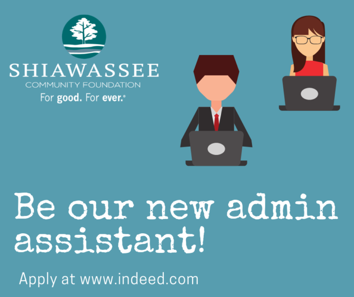 We are pleased to an immediate job opening at the Shiawassee Community Foundation as an Administrative Assistant. The position is part-time and located at our office in downtown Owosso. All applications must be submitted through our job postings on indeed.com.