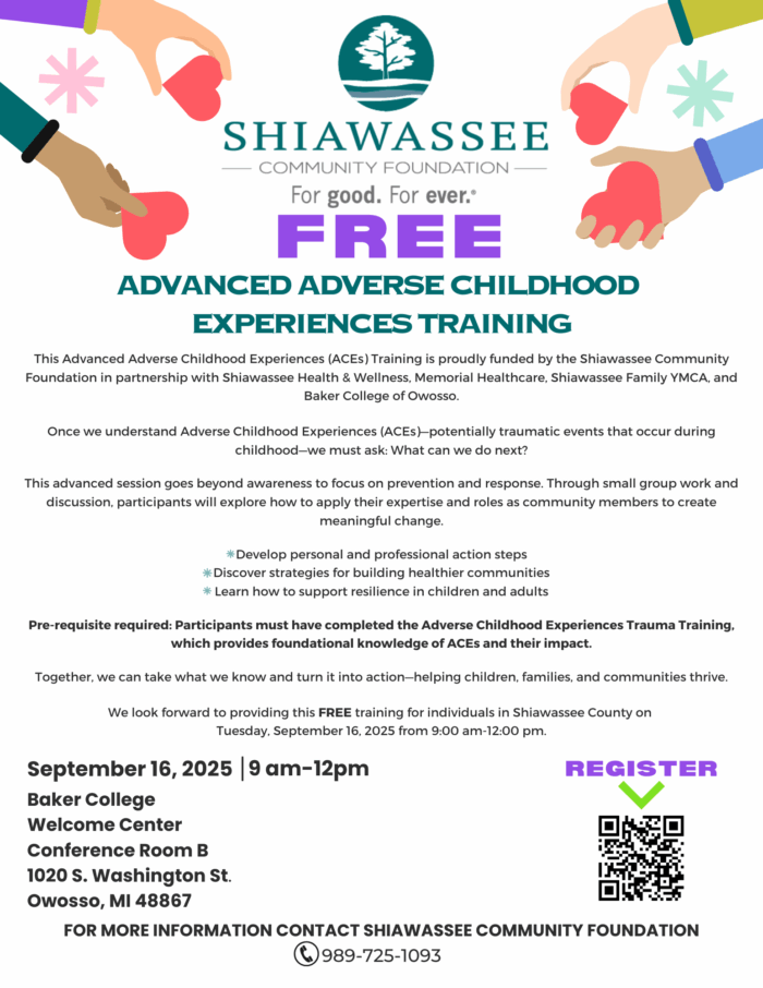 On Tuesday, September 16, 2025, the Shiawassee Community Foundation and partners will host an Advanced ACEs Training at the Baker College Welcome Center from 9:00 AM to 12:00 PM. This session, is designed for participants who have already completed the introductory Adverse Childhood Experiences (ACEs) Trauma Training.