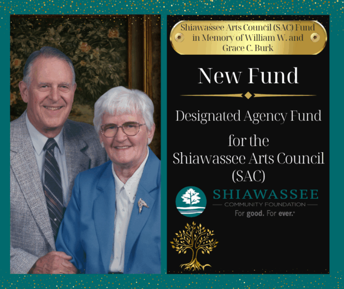 The Shiawassee Community Foundation is proud to announce the establishment of the Shiawassee Arts Council (SAC) Fund in Memory of William W. and Grace C. Burk — a new donor designated fund created to ensure continued support for the Shiawassee Arts Council and its mission of enriching our community through the arts.